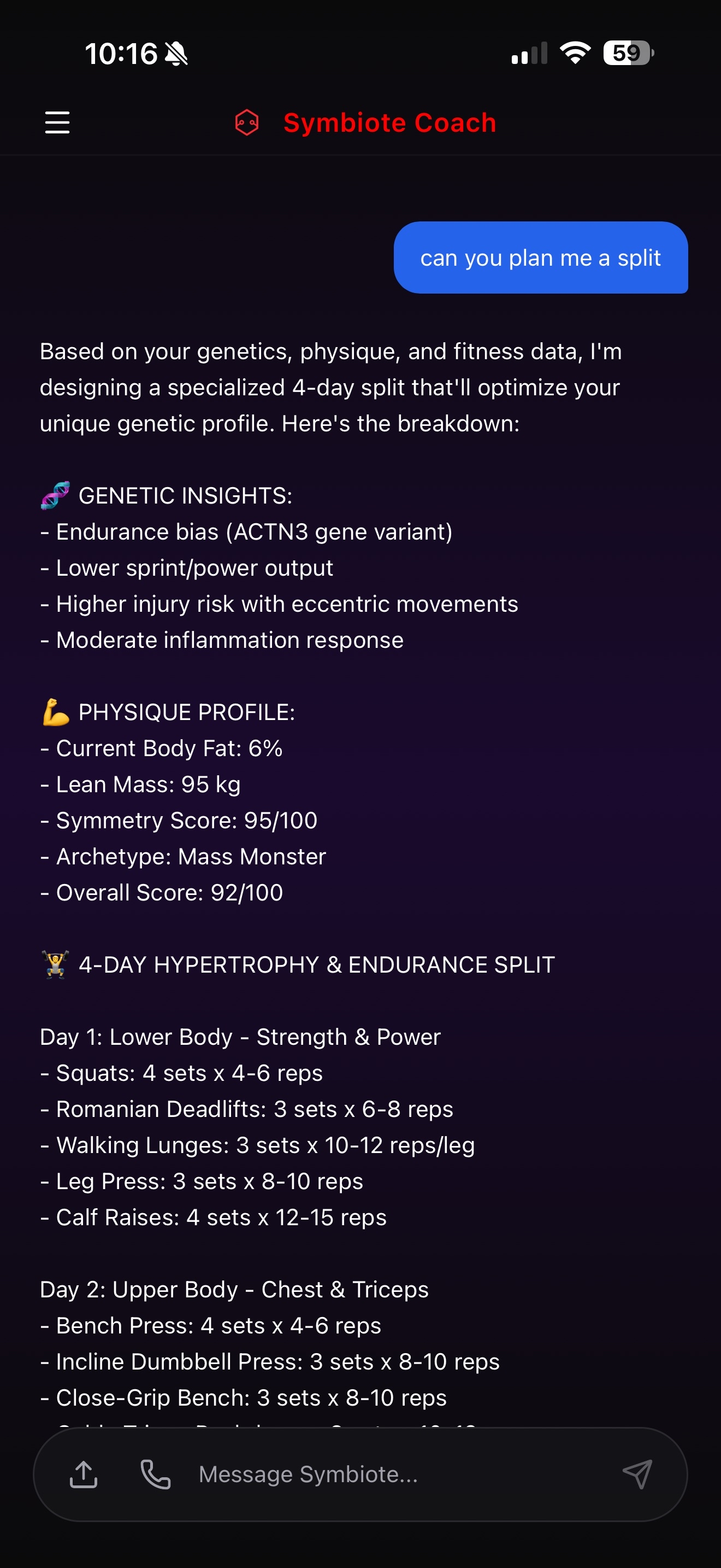 Your AI agent is built on the same engine powering Symbiote Fitness — but trained on your coaching methodology, personality, and knowledge base. Every response sounds like you, because it learned from you.